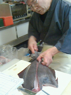 軽く飲んでいると親父が仕込みをやり始める。大きな鯛、大きなヒラメ、そして寒ブリと解体ショーみたいに見ていると当然食べたくなる。そして親父推薦の各部位を夜のお客様の前に戴く。当然少しの酒のつもりが・・・・・・。昼はカレーのつもりで夜は七草粥の予定だったが。