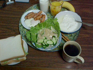 サラダはキャベツ、レタス、胡瓜、玉ねぎなどある物を使う。量は中皿1杯。ドレッシングは何種類かを代えています。ヨーグルトはブルガリアを半分、バナナ1本、ある時とない時がありますが目玉焼き&ベーコン、ウインナー炒め、飲み物はオレンジジュース、牛乳、珈琲で此れは変わらない。冬は事前にクリームシチューを作り冷凍して毎朝戴いたりします。