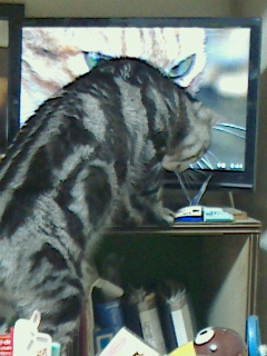 この写真は珍しくテレビの猫番組で猫が鳴いていたらテーブルに上がりテレビを見ていた。