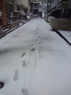 雪が降った。積もった。何十年ぶりかの積もり方。(我が足跡だけ、巴水のような画面でなく夕暮れのような昼前の降り始めのうらびれた風景)