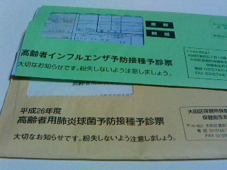 健康診断は区ではなく健康保険組合の指定の病院で受診しましたが高齢者インフルエンザ予防接種、高齢者用肺炎球菌予防接種が届く。