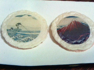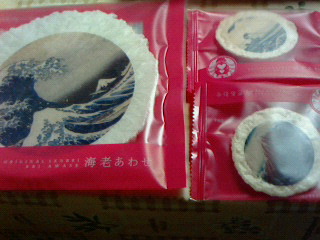 三越伊勢丹と東京国立博物館のコラボで葛飾北斎の富嶽三十六景の名場面えびせんとチーズサンドしたもの。