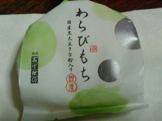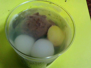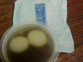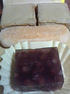 抹茶寒天に白玉、栗、小豆餡が入った寒天寄せ。小豆餡と抹茶寒天が喧嘩して甘いのか抹茶味が勝っているのか解らずあまり美味しくなかった。戴き物。
