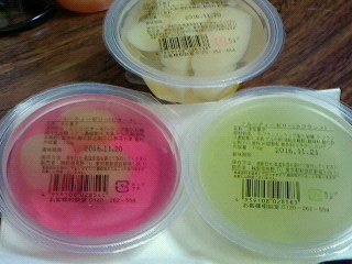 何種類もあり果肉が入った果物屋のゼリーで美味しい。ピオーネ・ラフランス・ピーチ・マンゴー・グレープフルーツなど季節柄の戴き物。