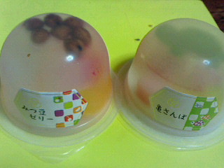 みつ豆、ナタデココ、赤えんどう豆、フルーツなどが入った夏の冷やしたゼリー。夏にはこういう冷たいお菓子がさっぱりして良い。戴き物。
