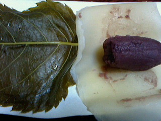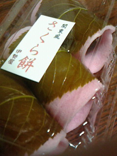 長命寺の桜もち、この時期になると食べたくなる。桜葉が3枚纏っているが店の話では乾燥を防ぐためで葉は食べない。
