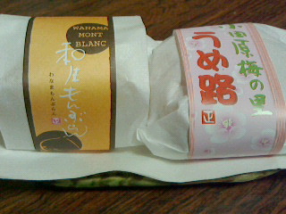うめ路は小田原名産の梅の果肉をカステラサンドで挟んだ和菓子屋の洋風お菓子。カステラの上に砂糖がまぶしてありテーブルが真っ白になった。白餡に梅味のすっぱみと甘さが微妙にマッチング。