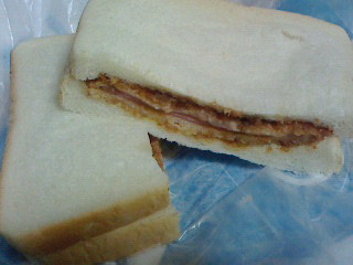 ハムカツは薄いハム二枚が揚げられている。マスタードバターにハムカツ、ソースをかけたいたってシンプル。コロッケパンも同じ。