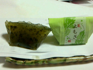 今話題の北陸加賀市の和菓子屋石川屋の季節限定の葛よもぎ、よもぎを葛で固めた中に餡が入った春らしいお菓子です。
