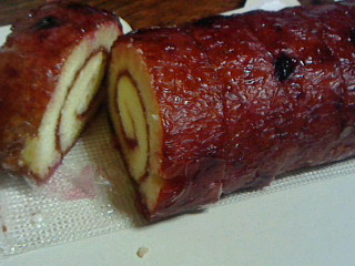 苫小牧のロールケーキで全体、中もハスカップジャムで挟まられ酸っぱさもあり甘味もあり何とも言えない微妙な味のロールケーキです。