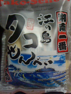 ママリンの小田原からのお土産。最初江の島のたこせんべいかと喜んだが私の思っていたメーカーのたこせんべいでなく小さい胡椒の効いたただのせんべいで残念。
