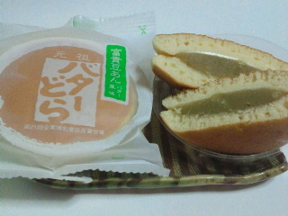 小ぶりのどら焼きで中の餡が富貴豆(あおえんどう)で餡の上にバターが薄く引いてあります。しつこいかと思いましたが以外にさっぱりしています。皮もふんわり焼きあがっていて甘さを感じます。