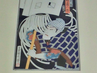 尾上菊五郎が纏いを持っています。纏いの田は神田の田からきているようです。そして1番組よ組は町火消の中で最大の人足数700名以上を数え人気も最高でした。よ組の担当地域は神田明神下界隈です。尾上菊五郎の屋号「音羽屋」が襟に書かれています。