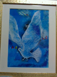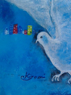 青の中に大きな翼の白い鳥が描かれ、脇には街なのか家々が描かれている絵です。実はなぜ購入したか今は解りませんし作家さんもどんな人なのかも知りません。購入した絵で作家の顔を知っているのはあまりいません。
