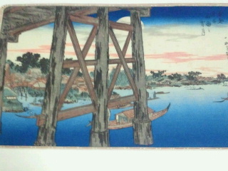 黙ってみると確かに広重というより北斎の感覚に見えます。夕焼けと霞んだ大きな月、これから繰り出すのか屋形船の客に,漁をしまい帰宅を急ぐ漁師の舟、まだ漁をしている舟と夕方の一瞬をとらえているようです。でも解説の涼風が吹き渡る風には感じないのは絵心がない、感性が鈍いのか。