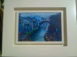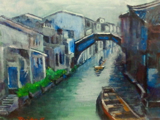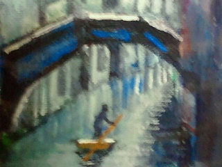 薄曇り、夕方の河川に小さな船を漕ぐ舟と変わった橋の構図。周りはうらびれた家屋の中、静けさだけが伝わる絵画です。