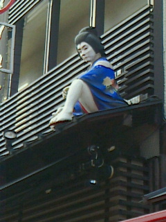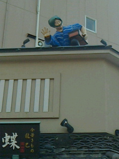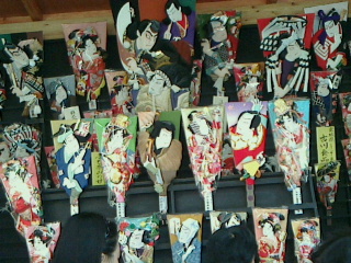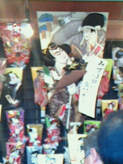 前にも載せましたが各店舗の上には歌舞伎の題材の人物が下を見ています。朝方は寒かったが風もやんで多くの人がいるからか暖かった。