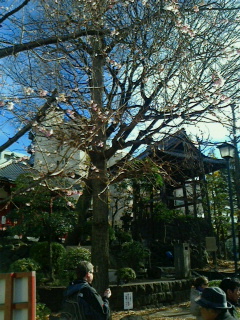 奥山では早咲きの梅が咲いています。奥の鐘楼は浅草の時の鐘。