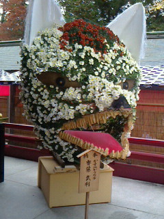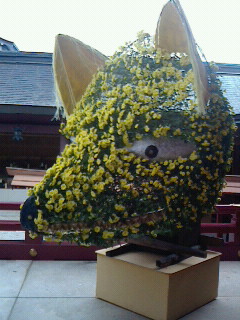 拝殿、本殿とあり拝殿の横には菊で作ったきつねの阿吽が。菊で景色を作った作品が沢山展示しています。幾つか載せて見ます。当然菊人形以外は無料。