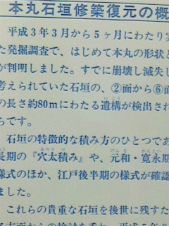 白旗峰に天守があったが今は石垣だけが当時をしのぶ。ただ平成7年に完成した石垣の全面修築、復元工事により石垣自体は工法は当時を倣っているが石が新しく何となく違和感がある。ただ石垣はこの新しいのと昔からの物と工法も色々あり石垣好きには楽しい。