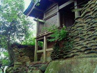 塀として囲っていた多分天守の瓦を使った塀も崩れています。その神社裏には大きな石がたくさん積まれています。そこも何とか乗り越えここから先へ降りようとチャレンジ。