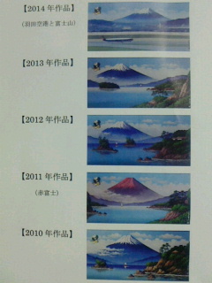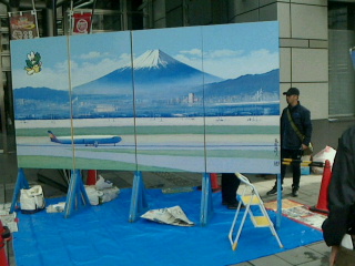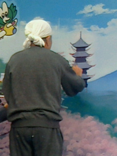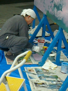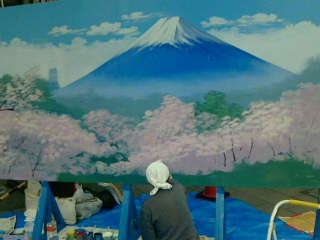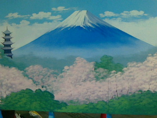 銭湯背景画は1時からという事で食事後もう一度見に行く。毎年描いている丸山清人氏が今年も描き始めます。昨年の羽田空港と富士山の絵の上に最初白墨で大体のあたりを付けて前年の絵を消しながら描いていきます。