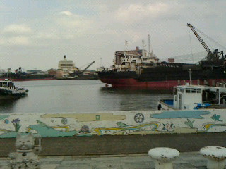 大量の砂を運ぶ船、60隻が係留壮観です。
