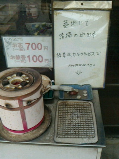 菩提寺の線香や花を売っているお店ですが係員が墓地内の清掃の為自分でお金を置いて線香に火をつけて持って行ってくださいと言う案内板、やはり墓参に来る人は真面目にお金を置いて行くようです。
