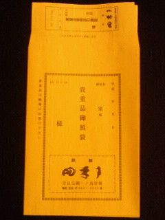 旅館などでは部屋に金庫もありますが別にお客様の貴重品として袋を用意しています。(写真の袋は他の旅館のものです。)