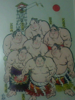 現代のシルクスクリーンの作品は若貴ブームの頃で松林モトキさんの作品。一番下が貴乃花、その上右が曙、左が若乃花、真ん中の一人が貴ノ浪、上から二番目右が武蔵丸、左が武双山、一番上が魁皇と今思えば豪華なメンバー。