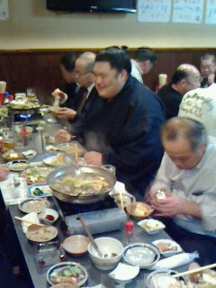 初場所が終わり彼らの慰労と会員相互の親睦を兼ね正月と6月に行っている会。大森の居酒屋正助市場の荻野さんに会長をお願いしています。寒い日にはきりたんぽ鍋が一番。