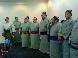 力士たちは相撲を取るのが仕事ですからしょうがないにしても部屋付の親方、マネージャーなどの裏方さんも少しは集めればと言いたいくらいでパーティ会場の外で話し込んでいたりするのが多い。