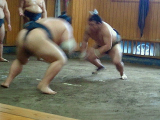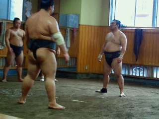 高砂部屋は本所4丁目にあり、もう若い人がぶつか稽古をしています。元朝乃若の若松親方が熱心に指導をしています。幕下の朝天舞、朝弁慶、この3月入門した朝西村の三人が熱心に稽古をしています。