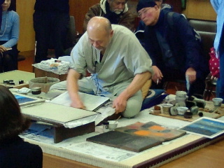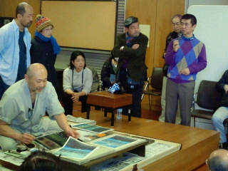 今回は摺っていた作品にはないのですがバレンの使い方による色々な作業も見せていただきました。出入り自由の会議室に超満員の見学者。巴水人気の凄さを感じます。