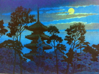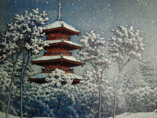 この所銀座の渡辺版画舗で巴水作品を買っていますが、見るとどうしても欲しくなる作品が出てきます。池上本門寺五重塔の夕景か雪景色さて。