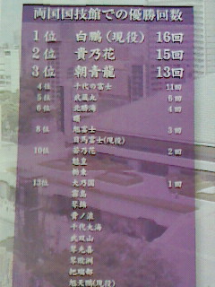 現在34回優勝の白鵬が東京でも16回で1位、2位が貴乃花15回(22回)、3位が朝青龍の13回(25回)と続いています。31回の優勝の千代の富士は東京では11回、全12回の武蔵丸は6回で5位となっています。