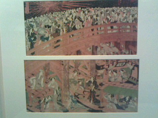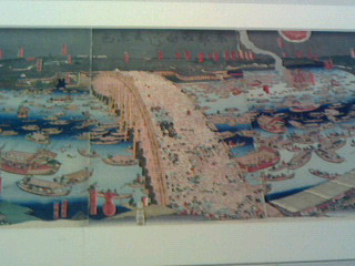 浮世絵はその時期(今)の風俗を描いています。当初は1枚の絵が2枚、3枚と続き物になり大きく迫力もでる浮世絵が出現。歌川貞秀の東都両国橋夏景色は6枚続きで一体何人描いているのかと思ってしまう。