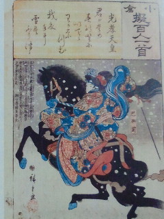 出展目録を見ると天智天皇から順徳院までのようです。そしてもどきですから歌の内容の絵ではないようです。今回の小倉擬百人一首は歌川派の国芳、広重、三代豊国(国貞)という豪華な三人の共作です。