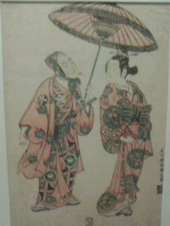 石川豊信の初代市村亀蔵の椀久と初代中村喜代三郎の松山ですが衣装には久、松山などの漢字が見える。これで役の名前が解るようになるようです。そして家紋で役者が解る?また傘には紋所がさりげなく描かれてもいます。
