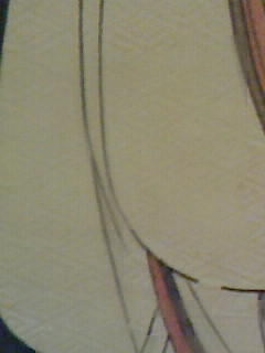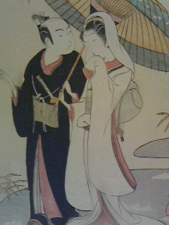 一筆斎文調「二代目市川八百蔵・二代目瀬川菊乃丞の相合傘」勝川春草こちらも着物には布目摺りが。