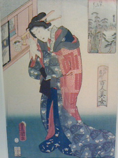 夏ですので夕涼み、蓮取りなどの風物、浮世絵の形としては団扇絵などを展示しています。作家は礒田湖龍斎、国芳などの作品が多い。