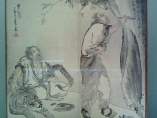 寒山拾得図屏風 長澤芦雪の作だそうで岸壁に詩を書く寒山、それを見ている拾得は虎を片手でなぜている。迫力のある屏風だがさてどこで使うんだろうか。