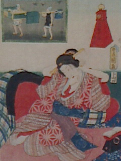 あかし風呂は6枚続きの大判で置屋の中が大きく描かれていますが1階の井戸から水を2階に汲み上げられるようで上段左上の風呂に入れるのでしょうか。ただ何処で湯を沸かすのか解らない。まさか水風呂なのだろうか?