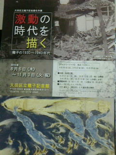 大田区馬込にある龍子記念館でも戦中戦後の時代の川端龍子の作品を展示しています。チラシの右上の写真は空襲を受けた龍子の住まい。この龍子のアトリエもそうですが母の実家も馬込でこの一帯も焼夷弾の嵐にさらされました。
