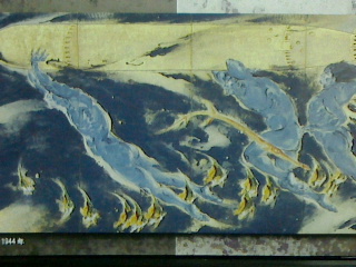 従軍画家?戦闘機や魚雷を水神が運ぶ「水雷神」龍子の庭に落ちた爆弾により庭で作っていた野菜が飛び散り大きな池になった「爆弾散華」なども展示されています。