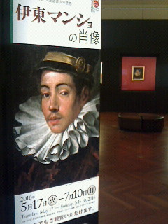 日伊国交樹立150周年記念として世界で初公開の伊東マンショを描いた肖像画を展示しています。7月10日まで。(看板の後ろにある小さな絵が肖像画です。)
