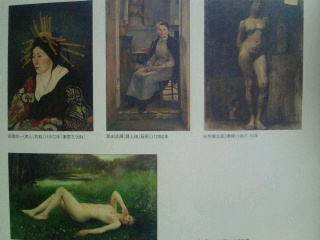 入口には黒田清輝、久米桂一郎、その後の岡田三郎助などの師のコランの草原に横たわった裸婦の「花月」が展示されています。同時に高橋由一の有名な「花魁」が展示されています。書き終えた作品を見て「わちきの顔はこんな顔ではない」と泣いたとかの有名な絵です。