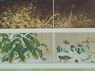 入場するとまず7Mを超える大きな作品が圧倒します。自宅の庭の壺の水を飲む愛犬は2M位の作品です。黒と金を使った屏風絵「草の実」雪の白と芭蕉の葉の緑が対象になって作品を持ち上げています。