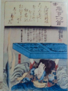 歌川派黄金期の代表絵師3人が描いている豪華版ですが残念ながら百人一首自体が解っていなく、その下の絵は百人一首と関係ない題材ですから余計わからない。