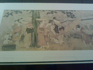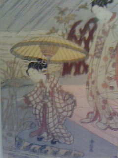 喜多川歌麿の大木の雨宿り、歌麿独特の美人画で雨に慌てて駆け込んで胸もあらわな美人、裸足で駈け出したという図で大木とは言いながらこんなに人が枝に雨宿りは出来ないが数は購買者へのサービスか?